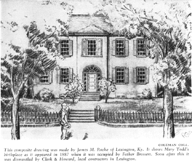 An artist's composite picture, based upon a photograph taken as the historic building was being razed, reveals a famous Lexington, Kentucky house - the birthplace of Mary Todd Lincoln.It was a fine two-story red brick edifice, which stood on the north side of West Short Street, immediately west of the St. Paul Catholic Church. The site is now occupied by the Parish House since the original building was torn down years ago.