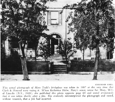 Mary's home, a nine-room residence with an ell in the rear, was erected by young Robert Smith Todd about 1813 on a lot belonging to the estate of Major Robert Parker, adjoining on the left his mother-in-law's house, which sat back some distance from the street and had a large front yard.