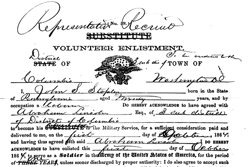 Whereas, Abraham Lincoln, a citizen of the District of Columbia, a citizen of the United States, not being required by law to perform any military service, has voluntarily and at his own expense furnished John S. Staples, in the District of Columbia, as a representative recruit to serve in his stead in the military forces of the Union, he is in accordance with the foregoing order, entitled to this official acknowledgement of his disinterested patriotism and public spirit.The little ceremony ended with handshaking all around and Mr. Lincoln expressing the hope that young Staples would be "one of the fortunate ones" among the soldiers.It can be imagined that the President and his "substitute" made quite a picture inasmuch as the former towered nearly a foot over the latter. Indeed, Staples presented such a contrast to his principal that the sargeant to whom he reported for duty as Mr. Lincoln's "ssubstitue" is reported to have remarked, "Aren't you just the first installment?"